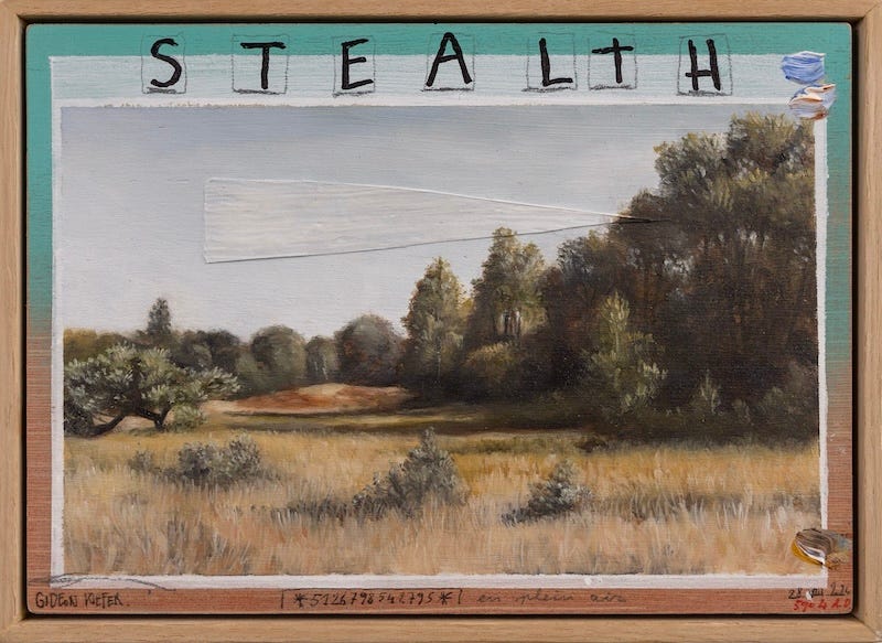 I was also thinking about the relationship between the known and unknown—the revealed and concealed—as I wrote about the paintings of Gideon Kiefer the other day. I particularly like a painting titled Stealth (pictured above) with a UFO-like shape that loosely resembles a paper cutout applied to an otherwise pastoral landscape.